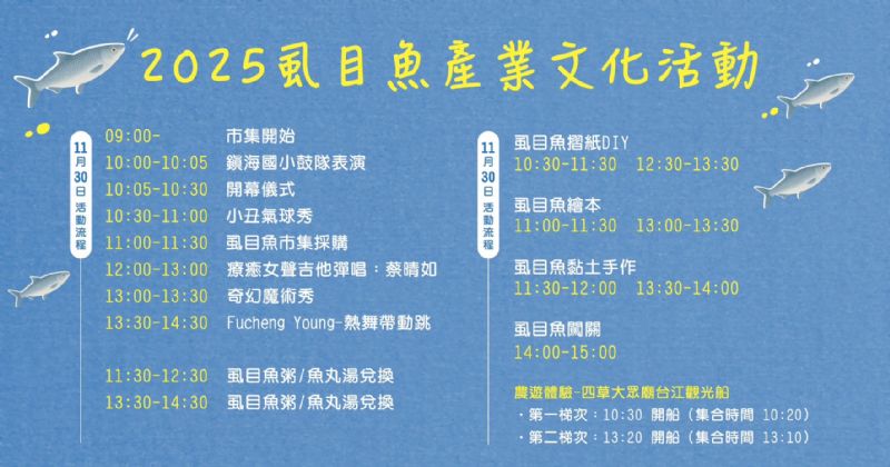 2025虱目魚產業文化活動,訂於114年11月30日上午9時至16時,在四草大眾廟廟前廣場舉行,歡迎各地旅客前來共襄盛舉。
