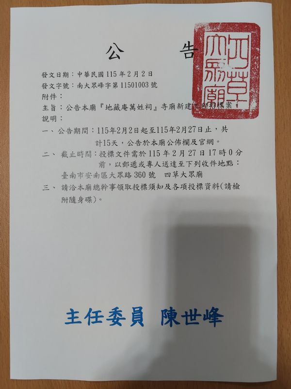 公告本廟『地藏庵萬姓祠』寺廟新建工程招標案,公告期間自115年2月2日起至115年2月27日止。