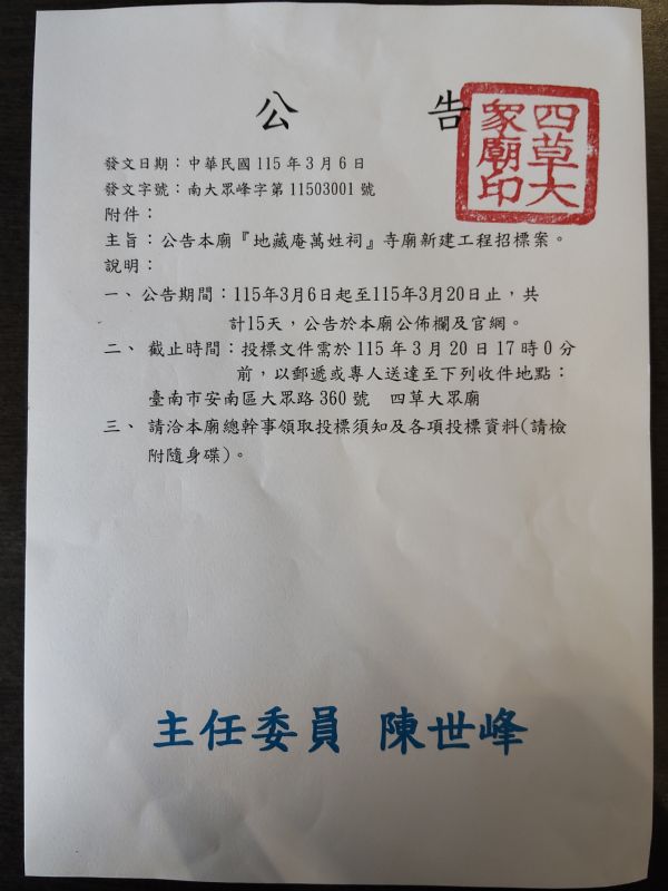 本廟『地藏庵萬姓祠』寺廟新建工程招標案第二次公告